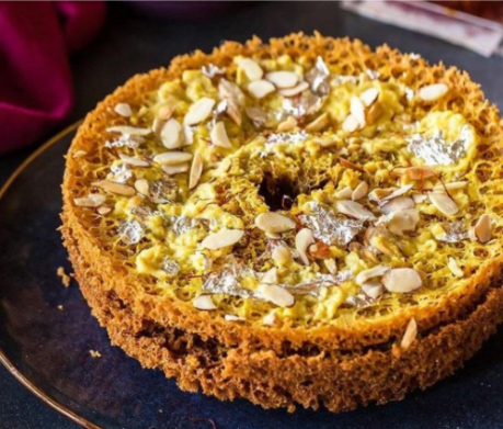 No Teej celebration is complete without Ghewar, Rajasthan’s signature festive sweet. Circular, honeycombed, and dripping with syrup, it’s a dish that embodies indulgence and joy.