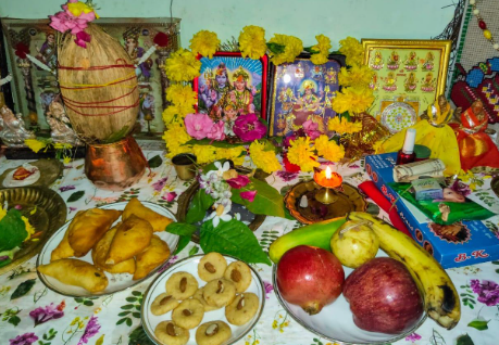 Temples dedicated to Lord Shiva and Parvati overflow with devotees. Those who can’t visit temples create altars at home, decorating idols or photos of the divine couple with flowers and red cloth. Offerings include bel patra, aak flowers, honey, shringar saman, fruits, and sweets, all symbols of prosperity and purity.